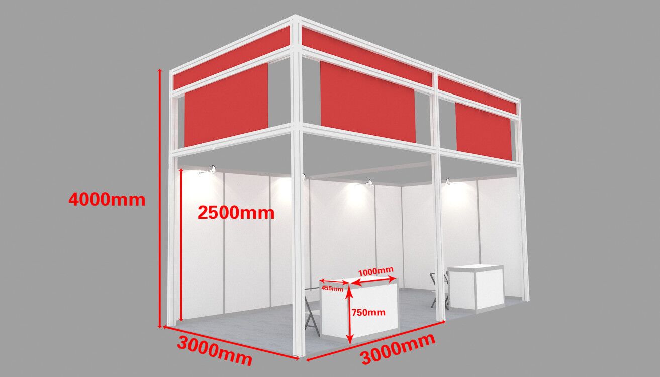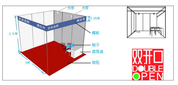 ■标准展位费用包括:展出场地、2.5m高壁板、楣牌制作、9平方米地毯、洽谈桌一张、椅子二把、10A/220V 单相插座一个,射灯二支。 ■空场地不带任何展架及设施,参展商可自行安排特殊装修工作或委托组织单位推荐的搭建公司。 标准展台示意图: